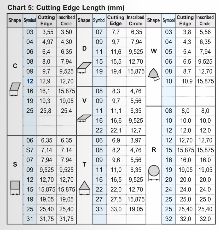 ตัวเลขสองหลักแรก แสดงถึงความยาวคมตัดของเม็ดมีดที่เป็นเส้นสัมผัสวงกลม IC ตามทรงของเม็ดมีด ไม่ว่าจะ 80, 55 หรือ 35องศา IC ในอดีตนั้นมาจากหน่วยนิ้ว พอมาคำนวณเป็นความยาวคมตัดจะได้ตัวเลขมีทศนิยม เช่น ทรงสี่เหลี่ยมจัตุรัส IC 9.525 ความยาวคมตัดก็จะเท่ากันคือ 9.525 จึงใช้เลขกลมๆ 09 เป็นสัญลักษณ์แทน ดังนั้นทรงมีดที่เหมือนกันระหว่าง SNMG12xxxx กับ SNMG09xxxx ก็หมายถึงขนาดของเม็ดมีดที่ต่างกัน ซึ่งส่งผลต่อระยะกินลึก ความแข็งแรงของเม็ดมีด ที่แตกต่างกัน