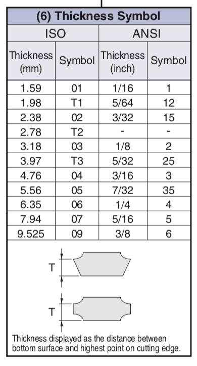 ตัวเลขสองหลักถัดมา จะเป็นตัวเลขแสดงถึงความหนาของเม็ดมีด ซึ่งก็มาจากหน่วยนิ้วอีกเช่นกัน ความหนานี้จะนับจากพื้นไปจนถึงปลายคมตัด บางเม็ดมีดจะมีส่วนที่สูงกว่าคมตัดซึ่งเป็นส่วนของร่องหักเศษ ก็ไม่ได้เอามาคิดความหนา ที่เราพบเห็นกันบ่อยๆก็จะเป็น 02 03 T3 04 06 ไม่ใช่ว่าทุกรูปทรงจะมีความหนาทุกขนาดครับ แต่จะเป็นไปตามสัดส่วนของความยาวคมตัด และทรงมีด